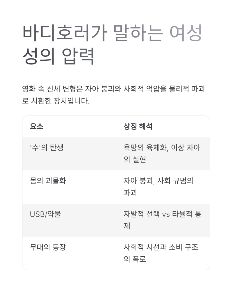 이 영화의 ‘바디 호러’는 단지 시각적 충격을 위한 장르적 장치가 아닙니다.